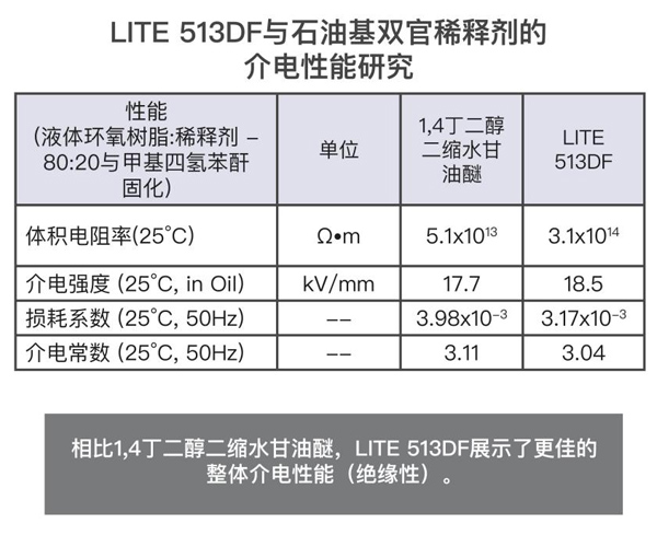 根據(jù)iec 62631和iec 60243標(biāo)準(zhǔn)進(jìn)行測(cè)試,如其介電性能所示,lite 513df提供了良好的絕緣性能。在epon 828的配方中,樹脂的使用量為20%,用mthpa(甲基四氫鄰二甲酸酐)固化,并用bdma(芐基二甲胺)催化。lite 513df展示了優(yōu)異的結(jié)果,其體積電阻率和介電強(qiáng)度更高,損耗因數(shù)和介電常數(shù)比競(jìng)品1,4丁二醇二縮水甘油醚更低。當(dāng)兩種稀釋環(huán)氧樹脂體系都暴露于高溫或鹽溶液中時(shí),lite 513df的性能優(yōu)于石油基雙官能稀釋劑。lite 513df是一款良好的環(huán)氧稀釋劑和改性劑,適用于電氣灌封、鑄造和封裝(浸漬樹脂)。